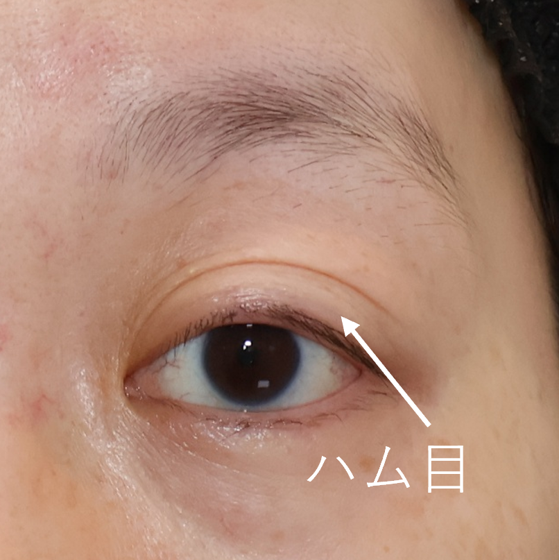 まつ毛の上の皮膚が多くハム目になっていること。